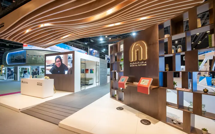 The design of this stand, influenced by the natural forms of sand dunes, blends hospitality with a strong connection to nature. Its flowing lines mimic the undulating landscape, while the central use of organic materials like wood and greenery creates a soothing, welcoming ambiance. The inclusion of natural elements, like the iconic olive tree, invites visitors to relax and engage with the brand in a calm, immersive setting. The soft lighting and layered textures evoke a sense of comfort, making the stand both visually appealing and functional for conversations.